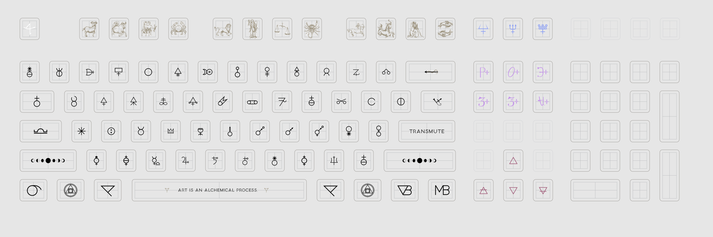 Letters and numbers are alchemy symbols (representing different substances). The shift key is moon phases, the 12 F-keys are months as zodiac signs. Some of the other modifier keys mean things like "sublimate" or "bath of vapors" etc.